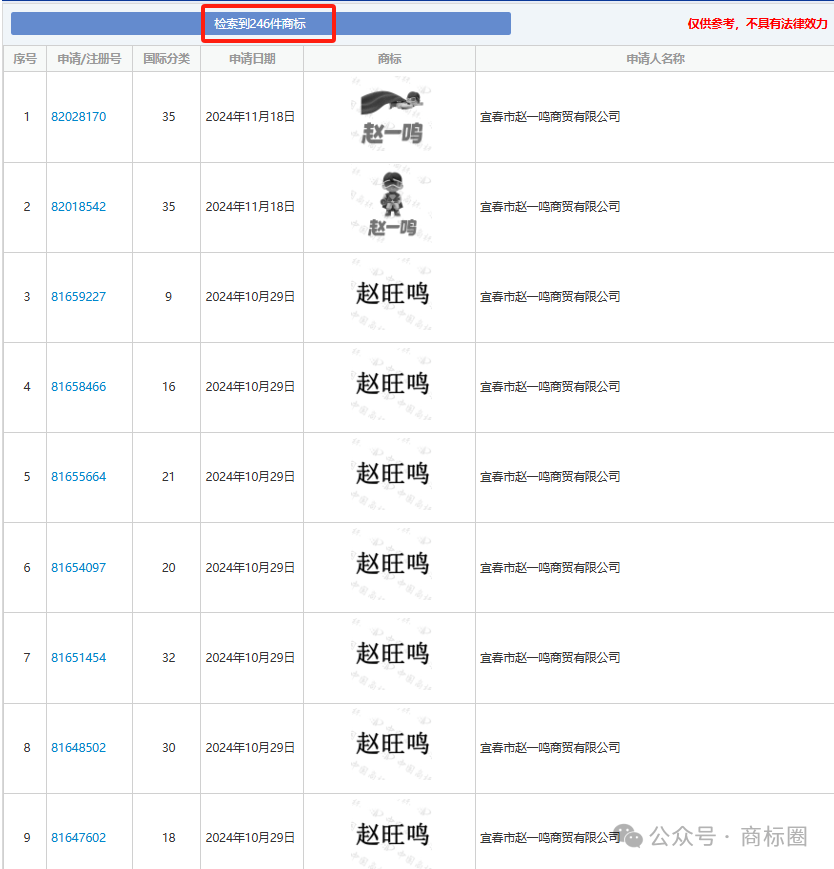 忠人之事”的办事,门店规模取品牌出名度由此飙升。防御商标就能阐扬感化,宣春市赵一鸣商贸无限公司名下目前共计申请246件商标,做值得相信的一坐式企业办事平台。2019年成立之初,值得留意的是,定位为以学问产权为焦点的一坐式立异创业办事平台。