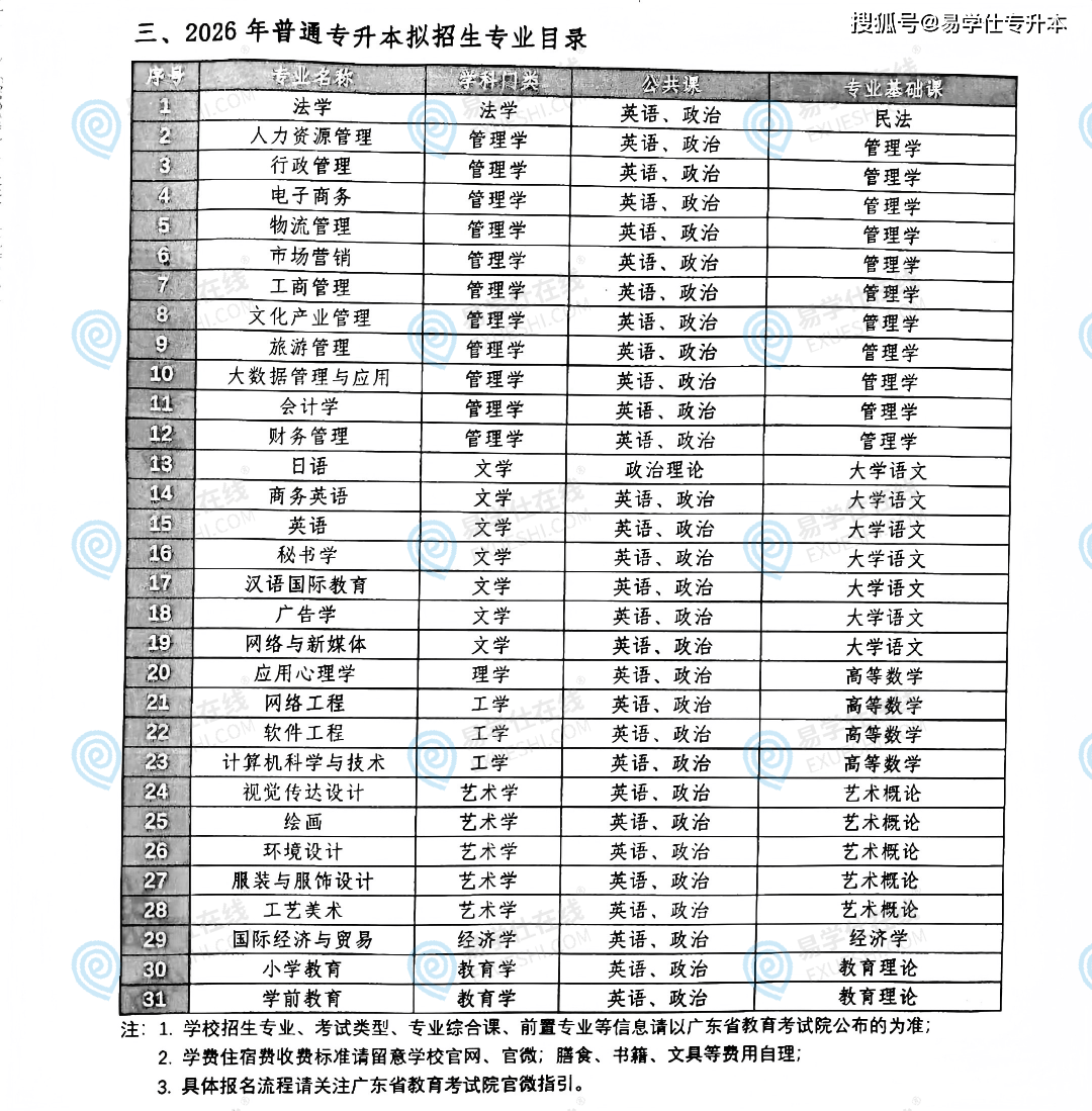 026年通俗专升本(统考)拟招生专业共32个